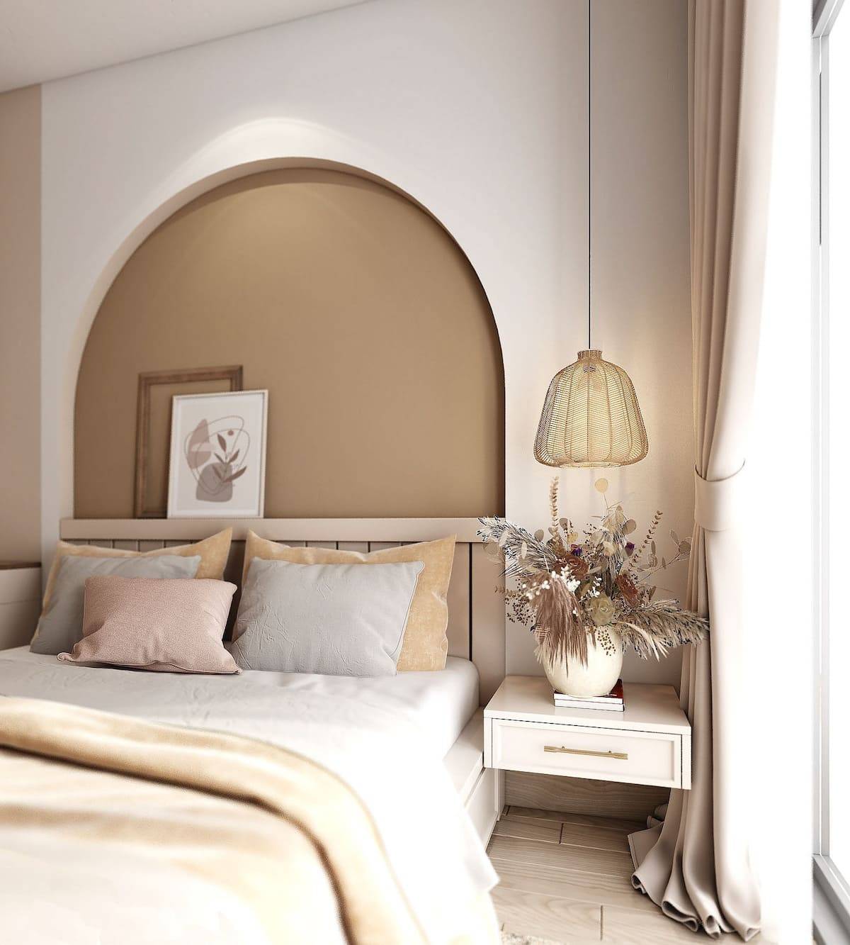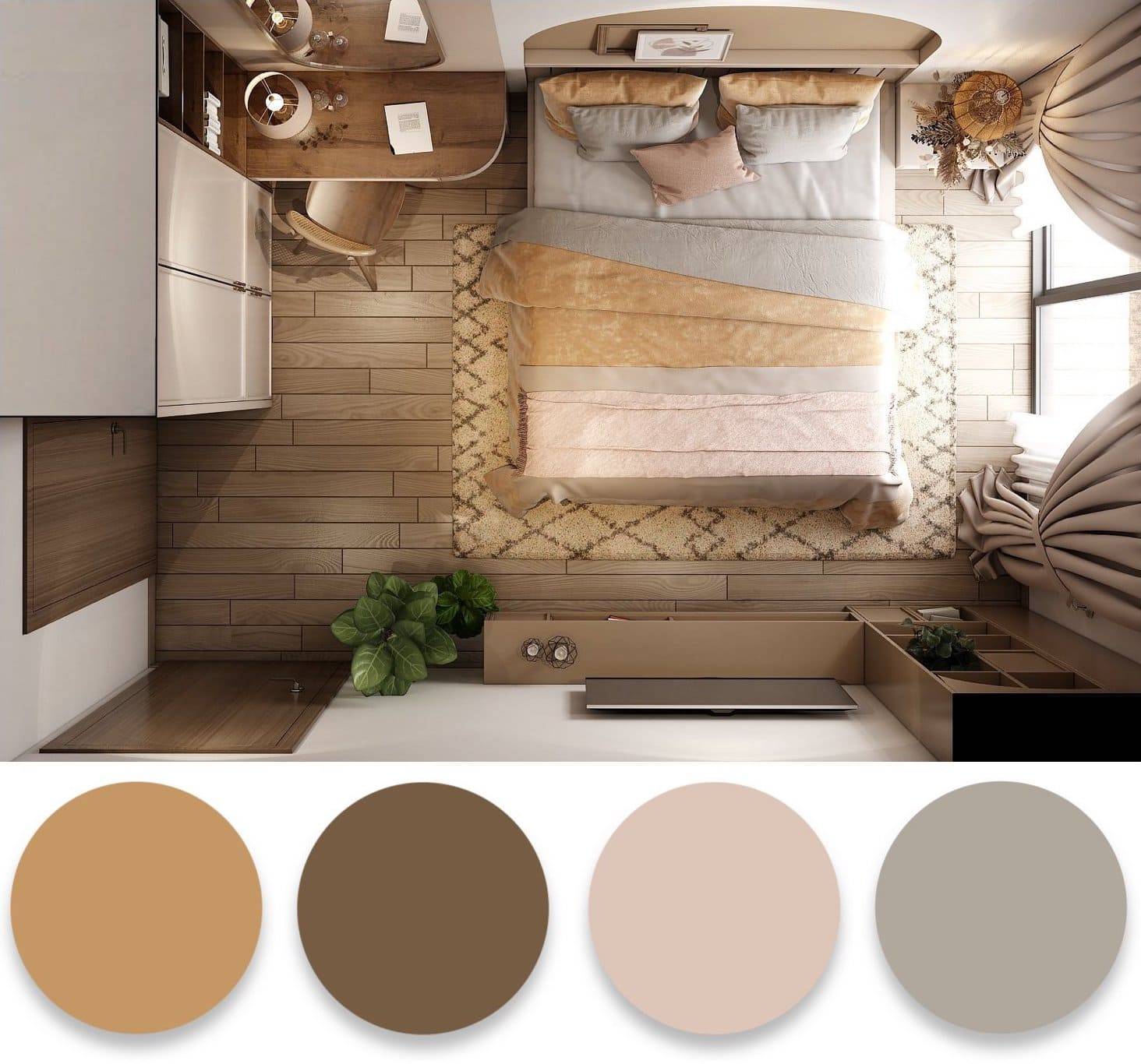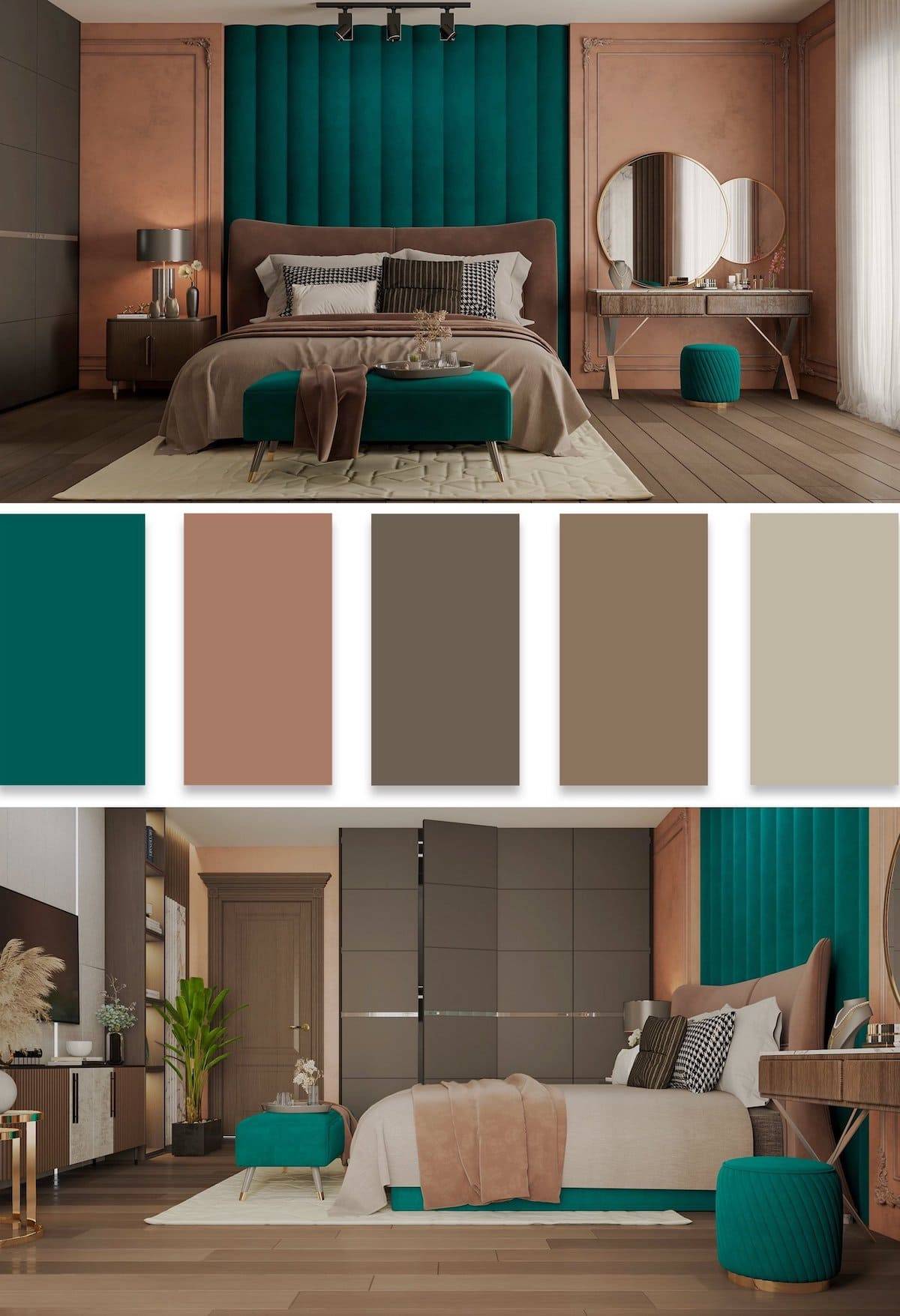 Поскольку спальня — место отдыха, где мы будем расслабляться, не надо использовать в ней насыщенные яркие цвета. Для спальни прекрасно подойдут мягкие пастельные оттенки розового и голубого, зелёный цвет. Гармоничным дополнением станет коричневое дерево.