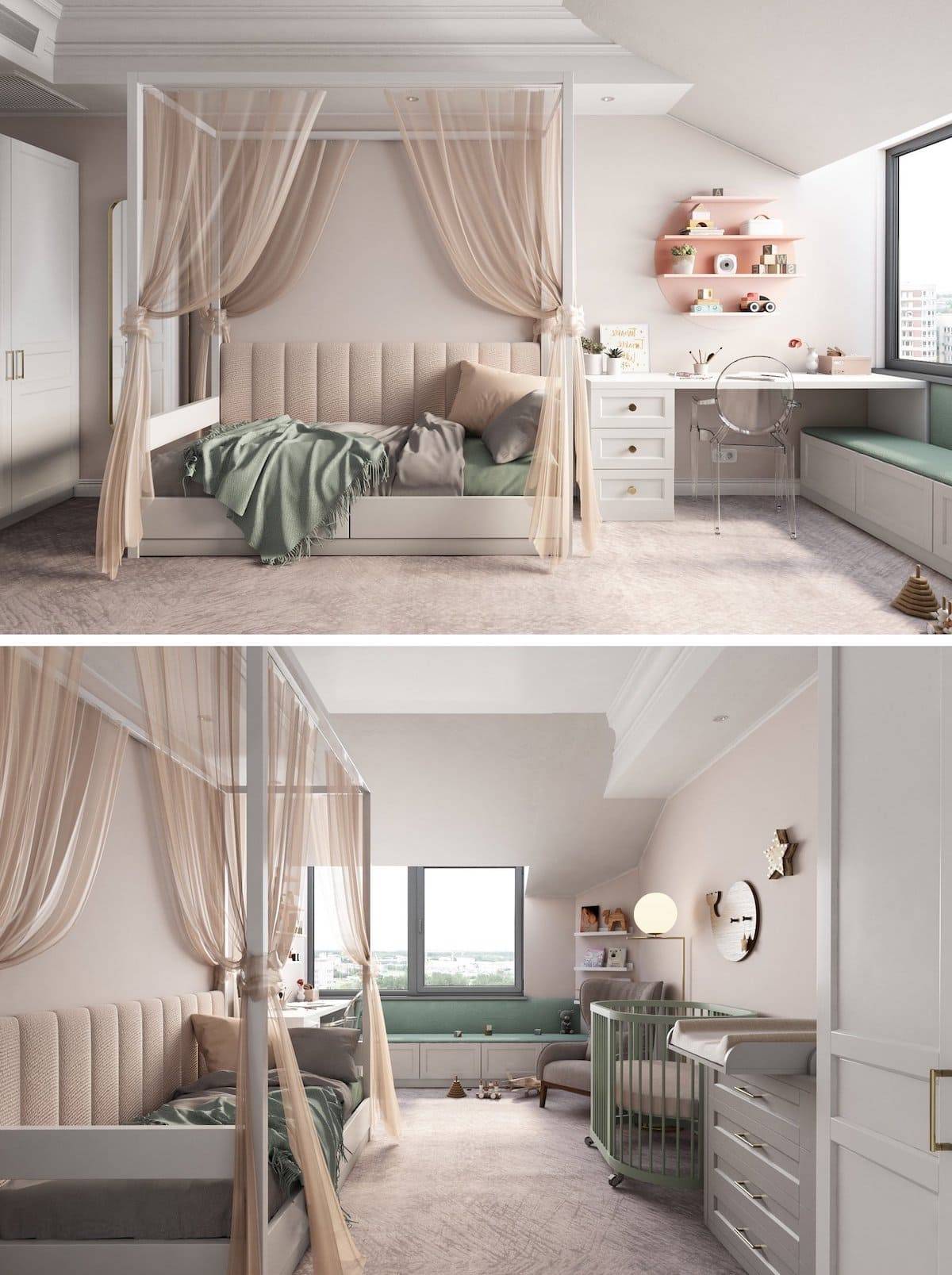 Обдумывая интерьер детской, важно учесть тот факт, что цвета не должны раздражать хрупкую нервную систему малыша. Будет полезно подобрать лёгкий оттенок зелёного, бежевый, нежно-розовый или светло-голубой, так как эти цвета благоприятно сказываются на развитии ребёнка