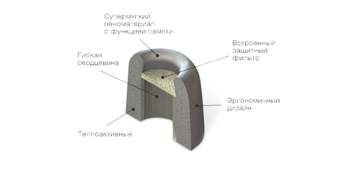 Сложная структура. Внешне амбушюры кажутся довольно примитивной составляющей частью наушников. Но весь секрет скрывается внутри. Мягкая и гибкая сердцевина имеет пористую структуру, которая, с одной стороны, обеспечивает постоянный приток воздуха, а с другой – надежно изолирует внешние шумы.