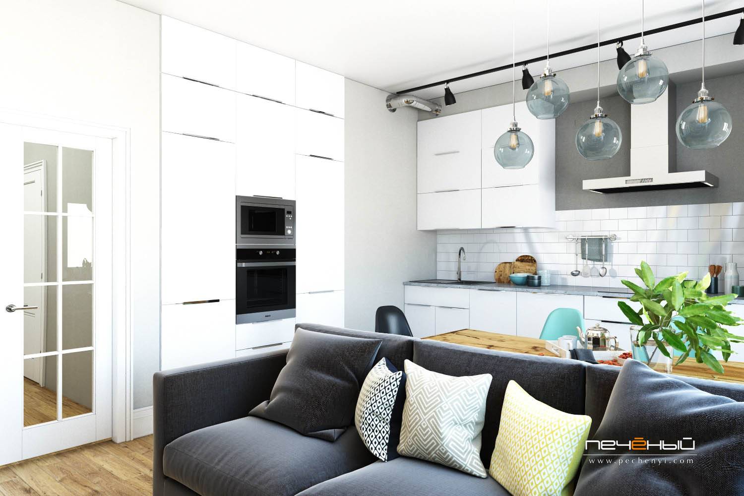 - Маленькая квартира, оформленная в скандинавском стиле, должна радовать белой отделкой стен, так можно визуально облегчить и расширить пространство.