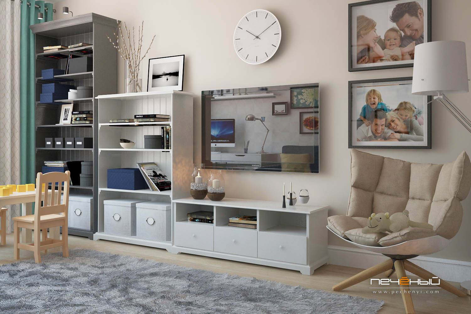 Корпусная мебель, которая представлена этажерками, полками, шкафчиками с открытыми и закрытыми полками, должна быть светлых оттенков белого цвета. Она может иметь ножки, или стоять на плоскости. Но по своей форме быть максимально простой, без излишеств.