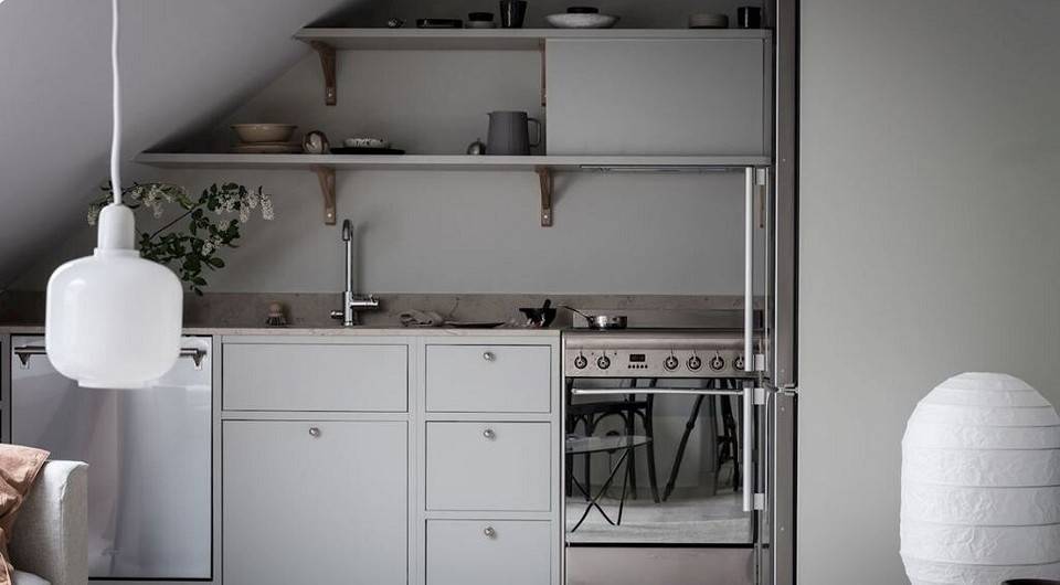 Скандинавские квартиры наглядно демонстрируют: даже самое «неудобное» и маленькое пространство можно задействовать с пользой, организовав систему хранения с помощью навесных полок.