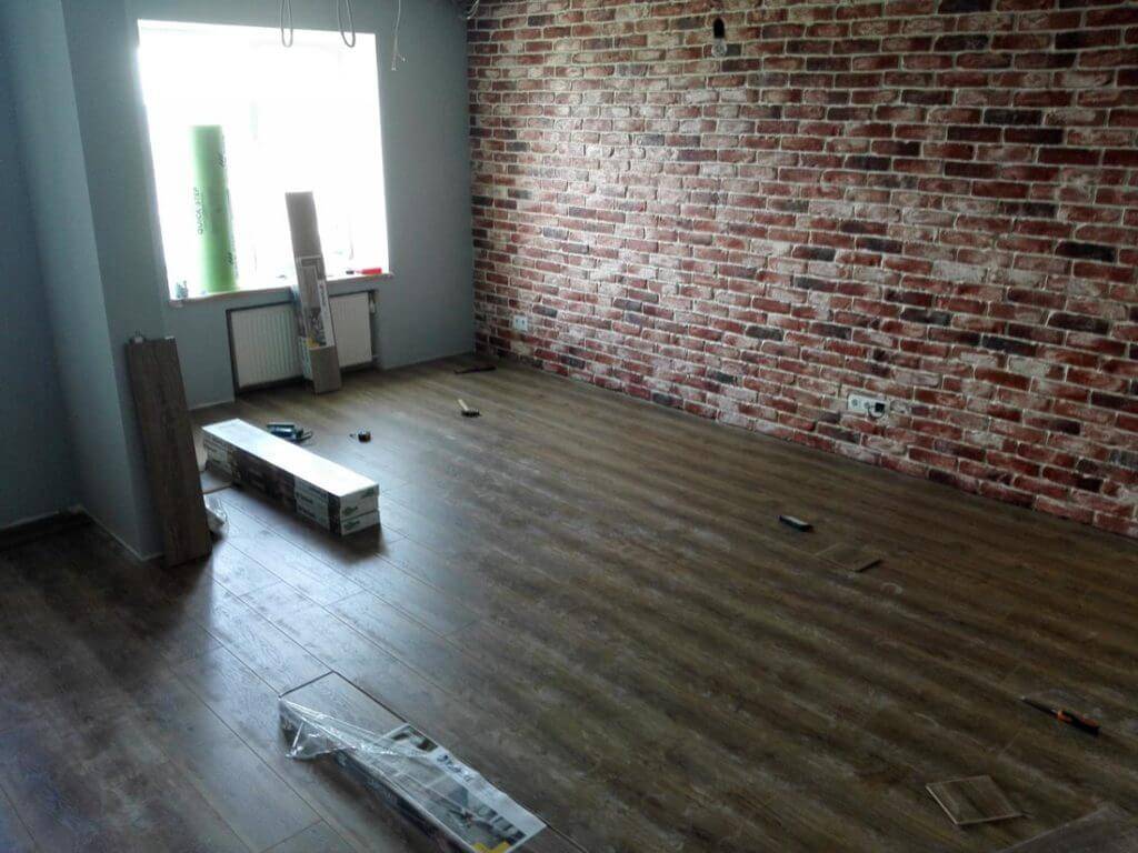 Гостинная-столовая. Темный ламинат, одна стена кирпич