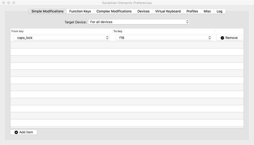 Simple Modifications. Простые модификации — здесь ты можешь заменить действие одной клавиши другим. Сначала жми Add item (+). В колонке From key выбирай кнопку, которую будешь нажимать, а в To key — значение той, которую должна получить система.