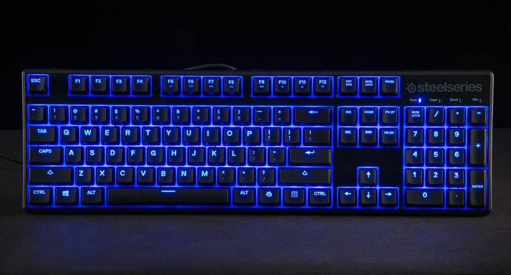 Тот вариант, когда «проще – значит лучше». Клавиатура с минималистичным дизайном, приятной голубой светодиодной подсветкой и механическими переключателями клавиш. Эта модель неброская визуально, зато очень качественная и надежная, что делает ее выбором профессиональных киберспортсменов. Цена SteelSeries Apex M500 составляет от 6990 рублей.