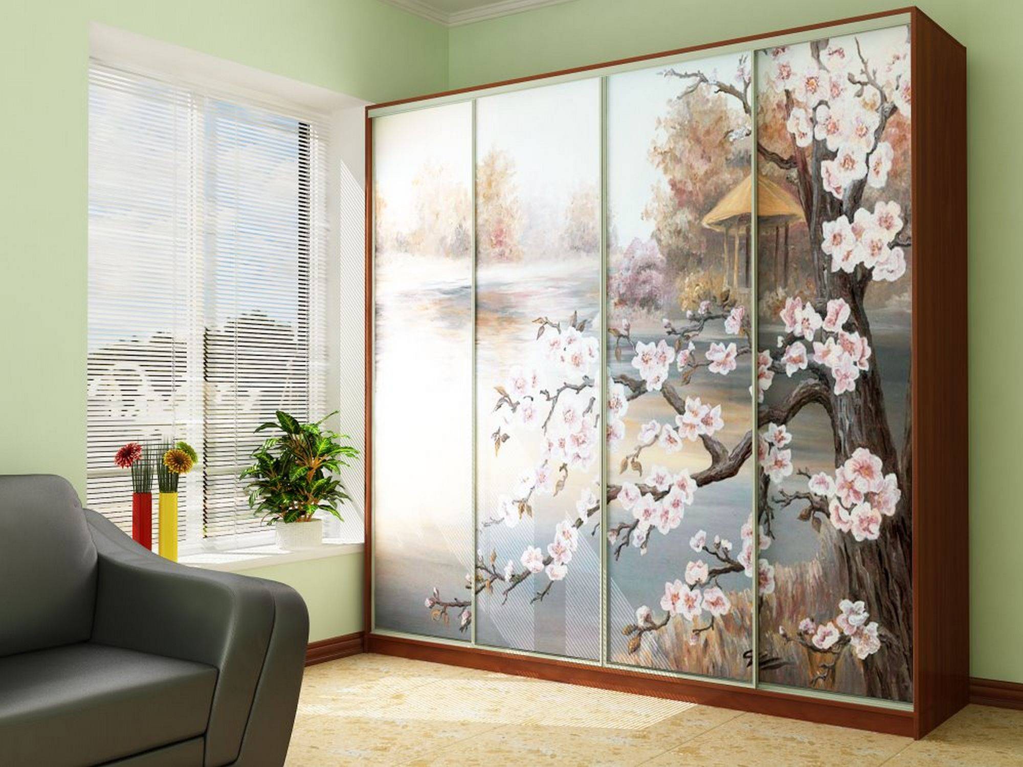 Фасады современных шкафов принято украшать. Для зеркальных и стеклянных поверхностей подойдут пескоструйные узоры или фотопечать. Можно выбрать рисунки различных стилей и направлений. Они легко наносятся, готовые поверхности неприхотливы в уходе.