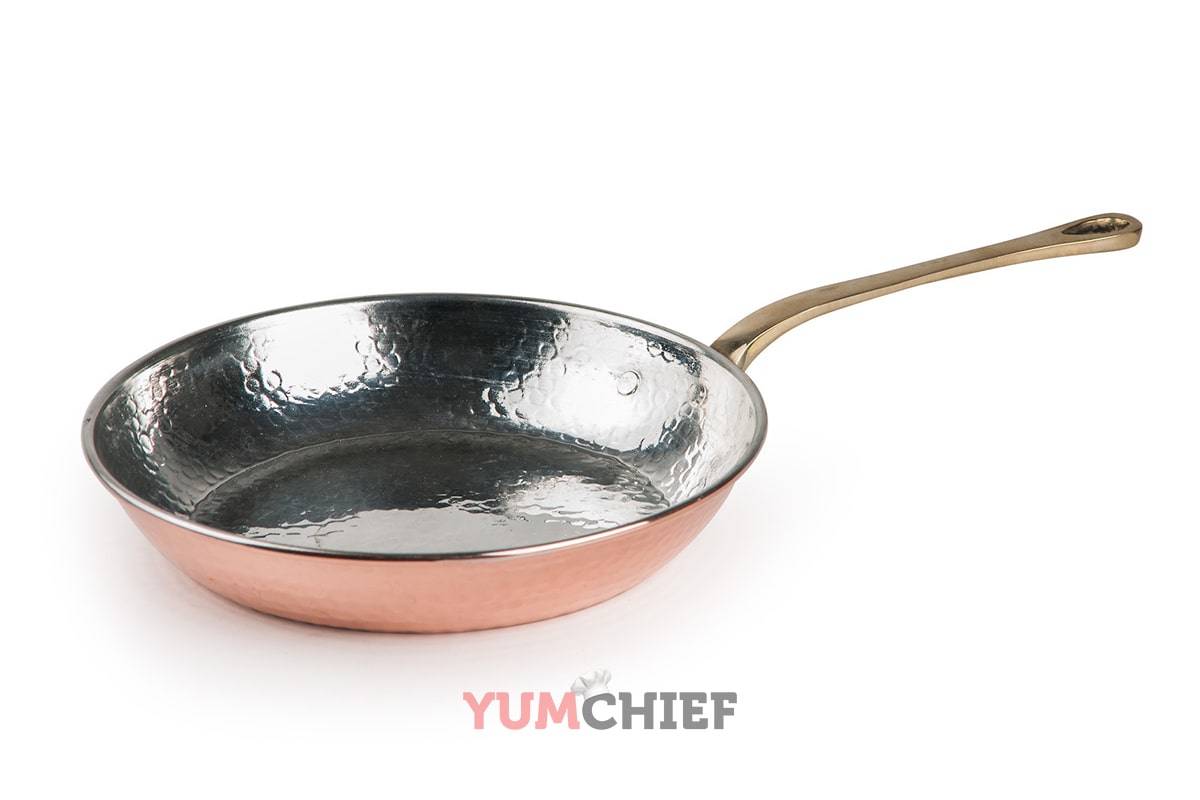 Внутреннюю часть медной сковороды обязательно покрывают нержавейкой, т.к. она более устойчива к высоким температурам, а ручку изготавливают из латуни, чтобы удешевить товар.