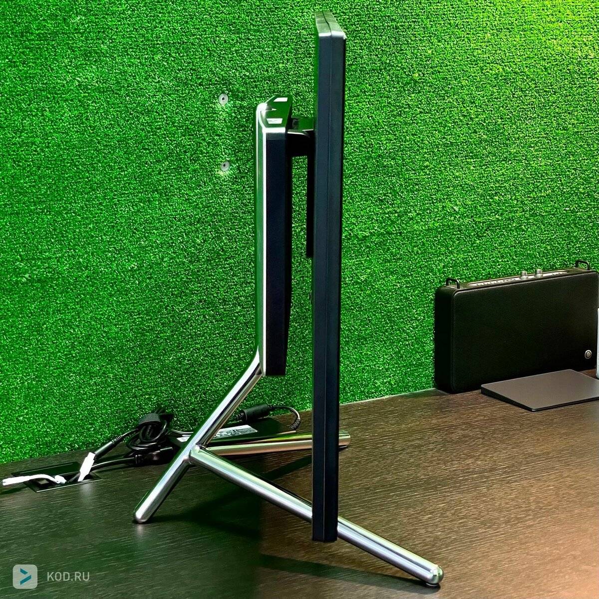 Панель с матрицей отделена от остальной электроники, которую расположили в отдельном блоке — их соединяет лишь шарнир, позволяющий крутить панель в двух плоскостях: по часовой стрелке до 90º и по наклону относительно стола от -3.5º до 18.5º.