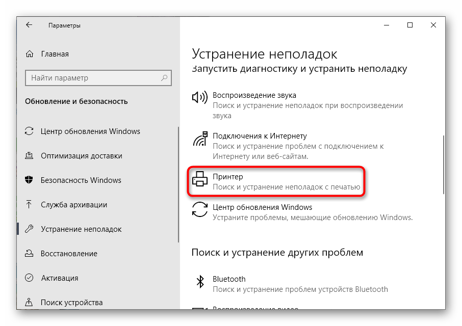 В списке устройств для диагностики найдите «Принтер» и нажмите по этой надписи.