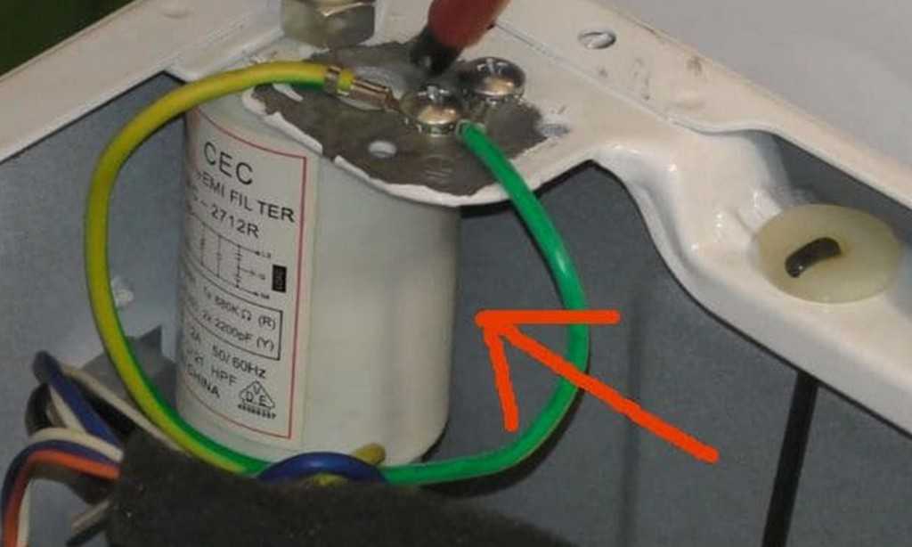 Данный фильтр располагается внутри стирального агрегата и крепиться на его корпус, через заземление. Поэтому, когда проходит напряжение через данное устройство, малый ток будет пробивать на корпус агрегата, из-за отсутствия заземления в электросети. Так как производители, собирают агрегаты, учитывая, что будет заземление в сети у пользователей, что в России редкость.