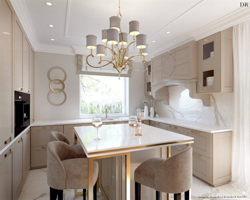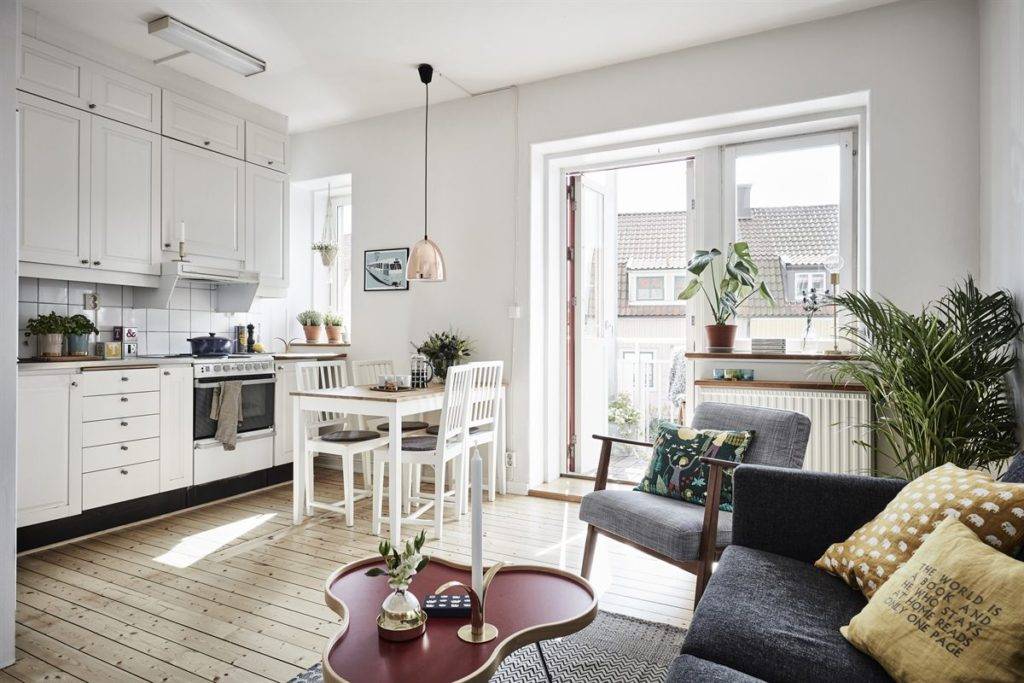 Если вы не хотите, чтобы кухня была пристройкой к гостиной, можно, например, оставить широкий проход между комнатами, закрытыми двойными или раздвижными дверями, отделить оба пространства ажурной стеной или оформить окно во внутренней стене. Приятным плюсом будет то, что такое решение позволит вам контактировать с другими домочадцами.