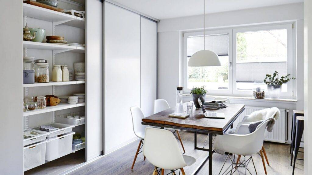 Кладовая — это дополнительное, небольшое помещение для хранения продуктов. Если ваша идея для кухни включает в себя подобное решение, кладовую лучше всего расположить рядом с главной комнатой, чтобы вам было удобно добираться за припасами. Лучшим местом по отношению к частям света будет северное, то есть такое, где солнечные лучи, способные обогреть комнату, не падают прямо.