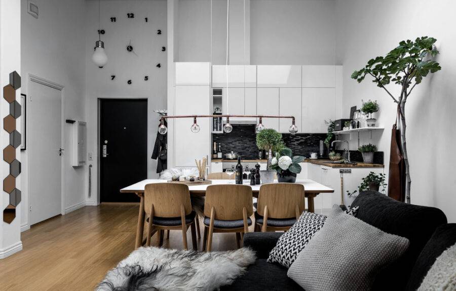 Умное решение в небольшой квартире или квартире-студии — разместить большой кухонный остров. Правильно расположенный, например, под прямым углом к самой длинной стене продольной гостиной, он станет кухонной столешницей, обеденным столом и даже столом для работы с ноутбуком.