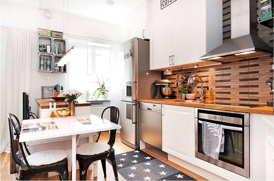 Как оформить кухню в маленькой, длинной, узкой комнате? Лучшее решение — спланировать ее по прямой линии или по L-образному плану. Если пространство позволяет, вы можете повесить вспомогательный столик на противоположной стене или даже полки и шкафы для хранения вещей. На маленьких кухнях идеально подойдут дополнительные шкафы на колесиках, которые можно легко перемещать в зависимости от потребностей.
