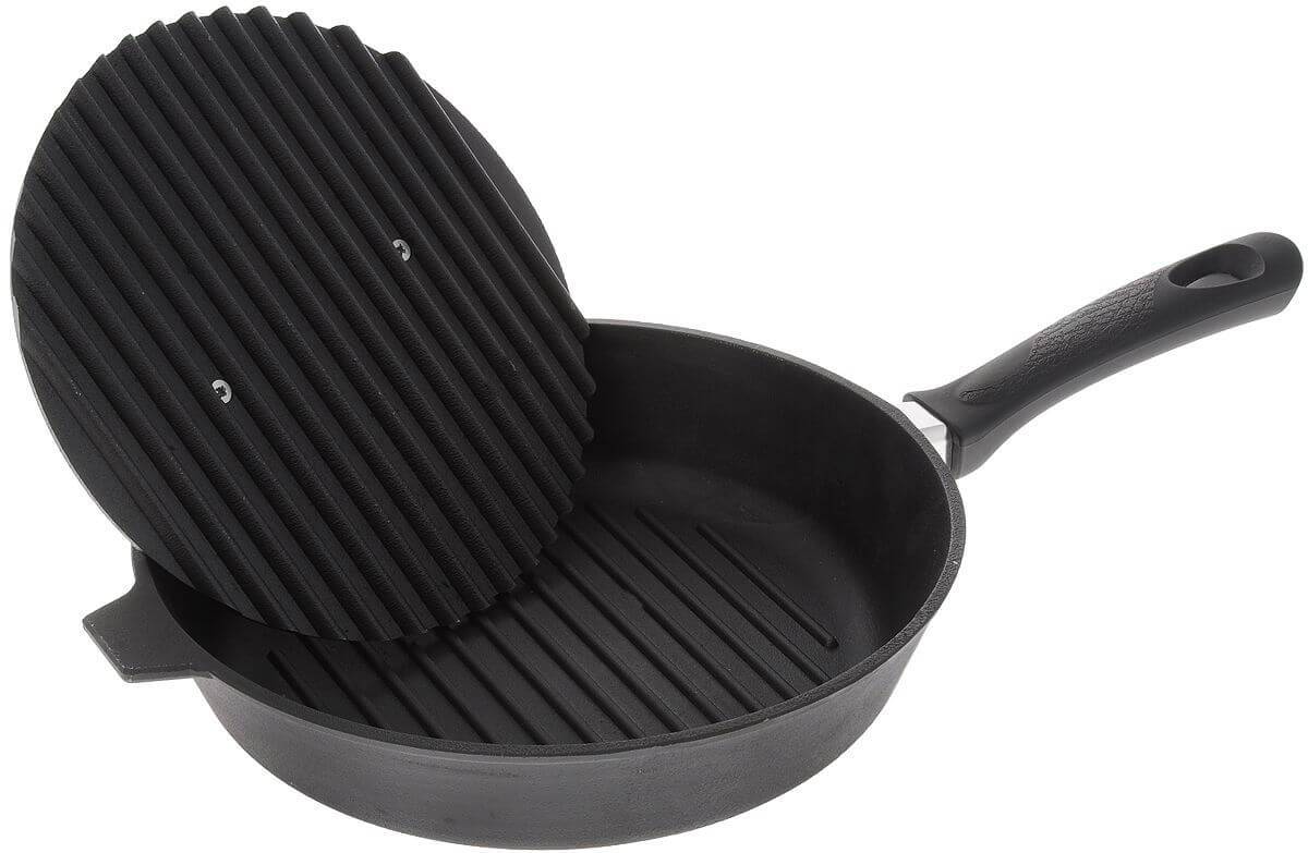 Прессы для сковородок гриль так же оснащены рёбрами, как и сама сковорода. В зависимости от блюд, которые будут готовиться, стоит ориентироваться, из какого металла приобретать сковороду – алюминий или чугун, ведь один из них тяжелее, а второй легче.