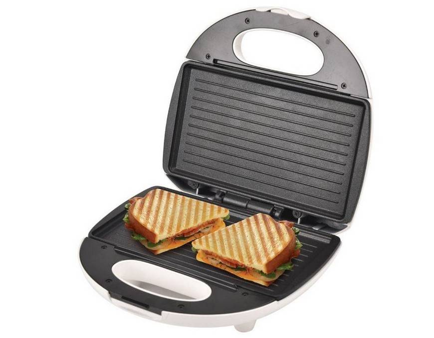 Сэндвичница состоит из двух нагревающихся пластин, между которыми зажимают бутерброд. Обычный прибор одновременно готовит от 2 до 4 сэндвичей.