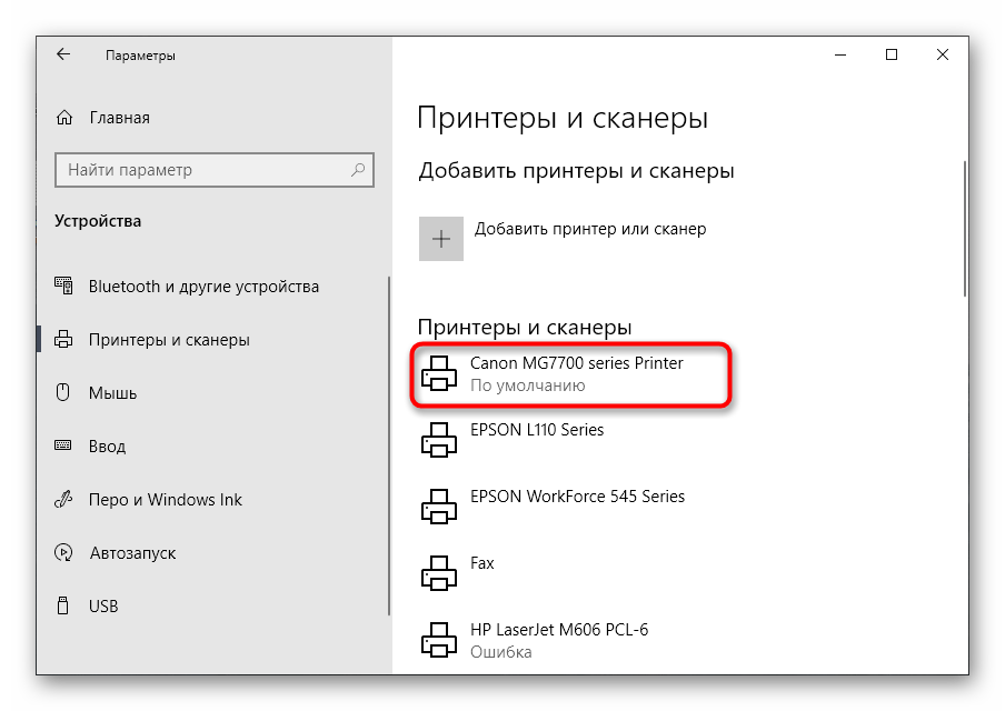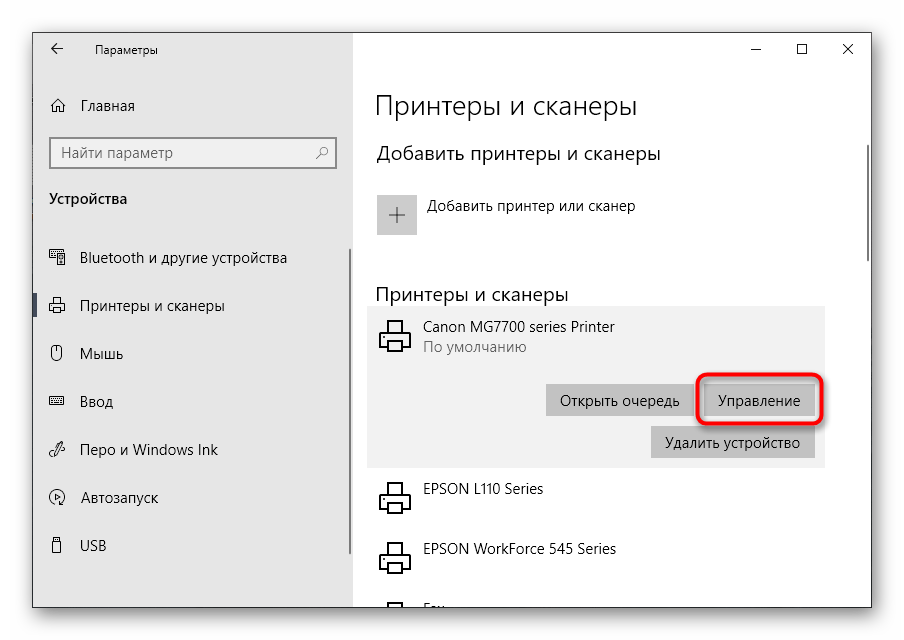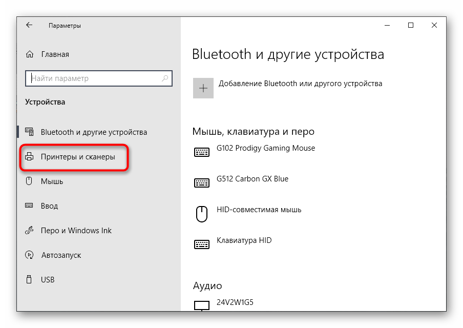 Через левую панель переместитесь к категории «Принтеры и сканеры».