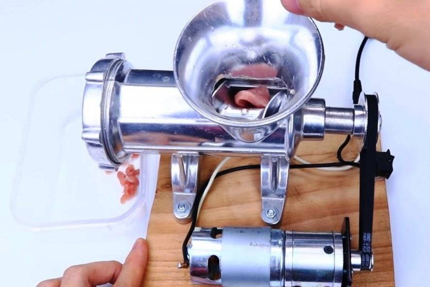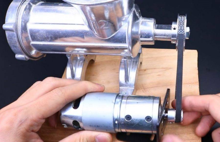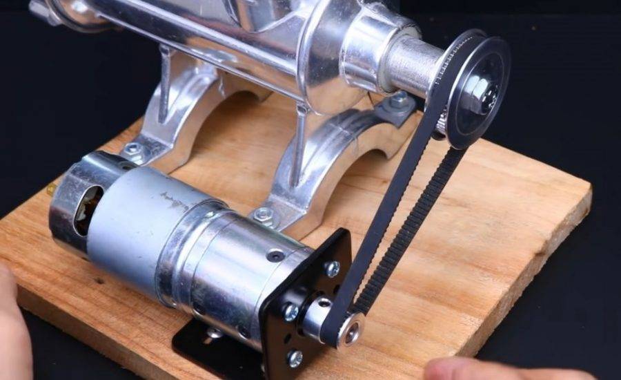 - Также добавлю, что расстояние от мясорубки до электродвигателя должно быть таким, чтобы его хватило для установки приводного ремня. Его необходимо установить немного в натяг, дабы исключить падение и вылет с устройства.