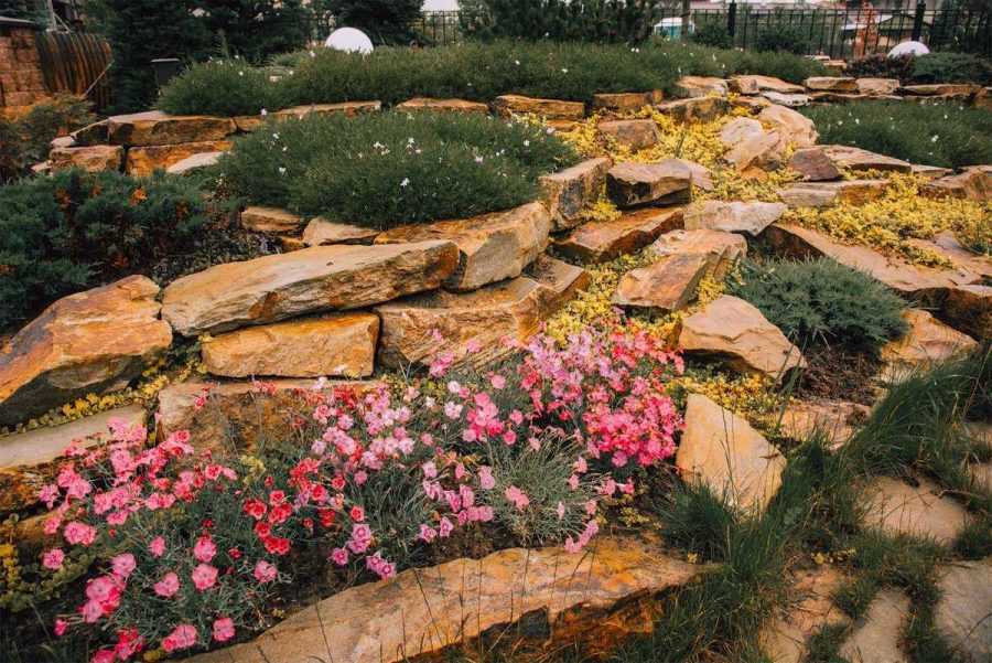 Вообразить альпинарий, в котором отсутствуют цветы, невозможно. Многолетние растения с красивыми цветками позволят сделать любой сад уникальным и стильным. Учитывая климатические особенности России, не стоит ограничиваться лишь альпийскими высокогорными растениями. В некоторых случаях уместным на каменистой горке будет присутствие культур, обитающих в лесу, степи или даже на морском побережье. Есть даже мексиканский вариант альпинария с кактусами. Украсить альпинарий могут эдельвейс альпийский и флокс шиловидный, карпатский колокольчик и камнеломка и многие другие виды растений.
