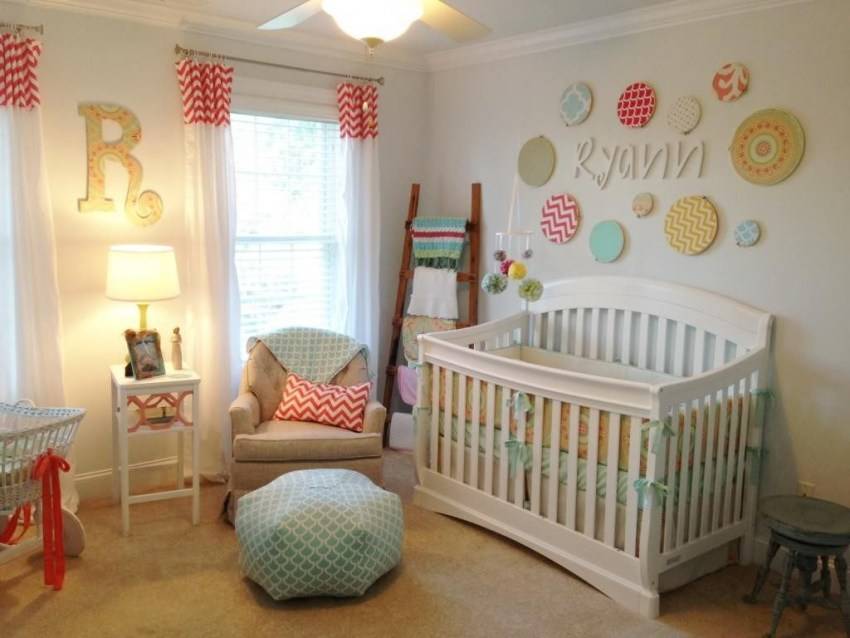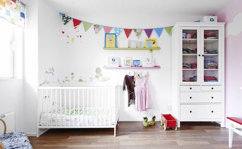 Дизайн комнаты для новорожденного оформляют, ориентируясь на пол ребенка: девочкам больше подойдет розовый и золотистый, а мальчикам – голубой и синий цвета. Наличие настенных ковров недопустимо, поскольку они будут отлично собирать на себе пыль.