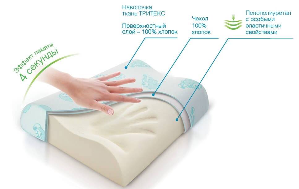 Во-первых, это наполнитель. Самый популярный – Мемориформ. Есть ортопедические подушки с другими наполнителями, но они на так идеально повторяют контуры головы.