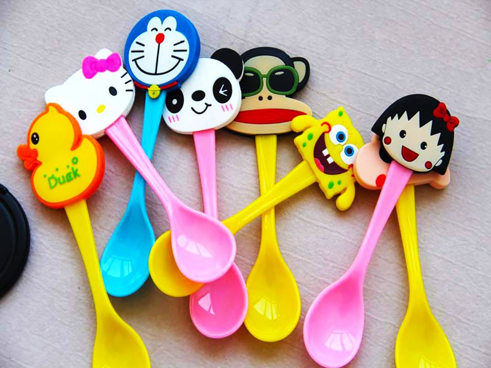 - Ложки для детей, как правило, отличаются рукояткой из резины или пластика. Такой прибор используют, чтобы кормить малышей, которые не едят сами.