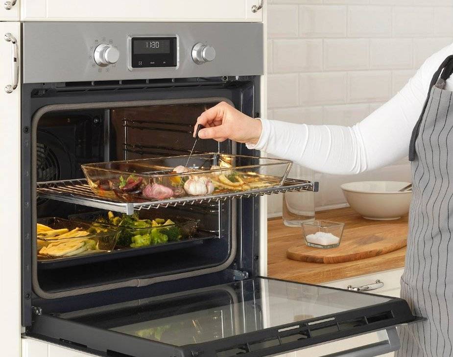 Перед загрузкой блюд в духовку уберите из нее все лишние предметы. Если необходима только решетка, то нельзя оставлять противни. И наоборот. Эти элементы не принимают участие в готовке еды, но одинаково загрязняются. Кстати, труднее всего отмывать решетки, а используются они реже всех элементов.