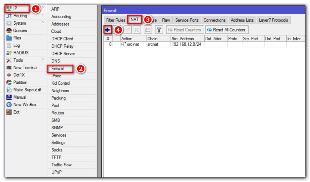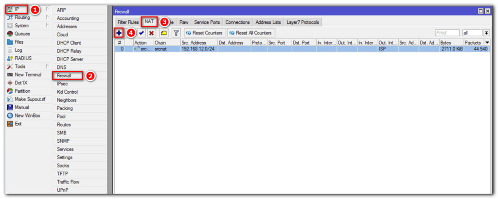 Откроем: IP=>Firewall=>NAT=> “+”.