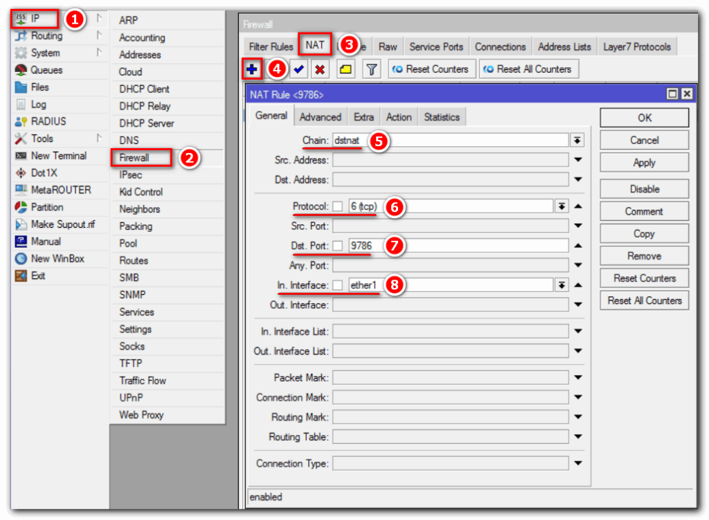 Чтобы получить доступ к видеосерверу, необходимо пробросить порт 9786. Откроем Winbox и добавим правило: