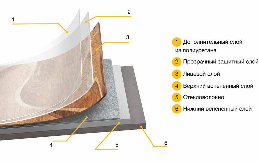 - Вспененный холстовой слой. Элемент декора. Именно на него наносят рисунок, который размещен на линолеуме. В большинстве случаев изготавливается из поливинилхлорида (ПВХ).