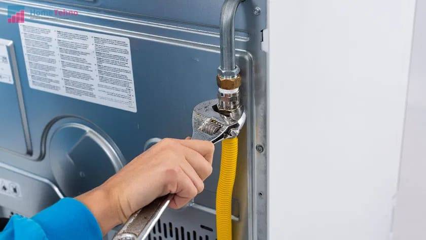 - Гибкий шланг подключается к газопроводу. Для этого резьбовое соединение обматывается уплотнителем (лентой ФУМ) и затягивается соответствующим ключом.