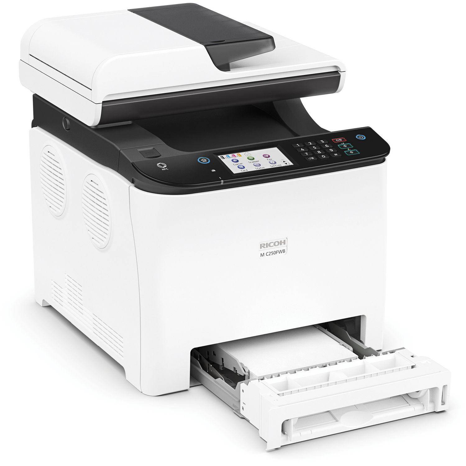 Это МФУ ориентировано на печать текстовых документов и несложной графики (например, диаграмм и изображений с небольшой детализацией). Лазерный МФУ использует 4 цветных картриджа. Максимальное разрешение при печати составляет 0.6К, но при этом скорость работы очень высокая. Так, даже при выводе цветных изображений принтер способен «разогнаться» до 24 страниц в минуту, а на первый лист требуется 9-10 секунд в зависимости от заполнения. Работает с бумагой до А4 включительно, глянцевой и матовой с плотностью до 200 г/м2.