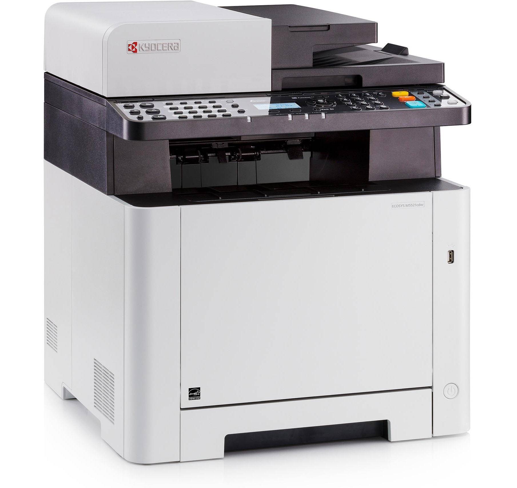 Поддерживает проводное и беспроводное подключение к локальной сети, связывается со смартфонами по NFC для работы AirPrint. Есть порт USB для печати с флешки.