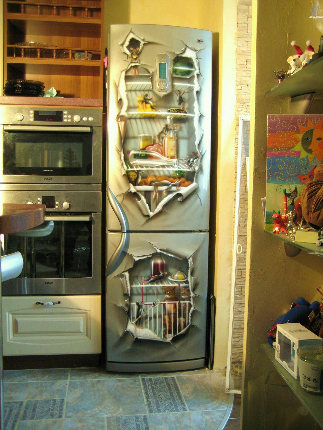 Смелый и стильный декор обеспечит наклеивание виниловой пленки на всю плоскость. Специализированные компании производят широкоформатную печать на виниле, в том числе и по вашему выбору. Можно наносить на наклейки 3-D изображения, которые превратят ваш холодильник в необычный предмет кухонного интерьера.