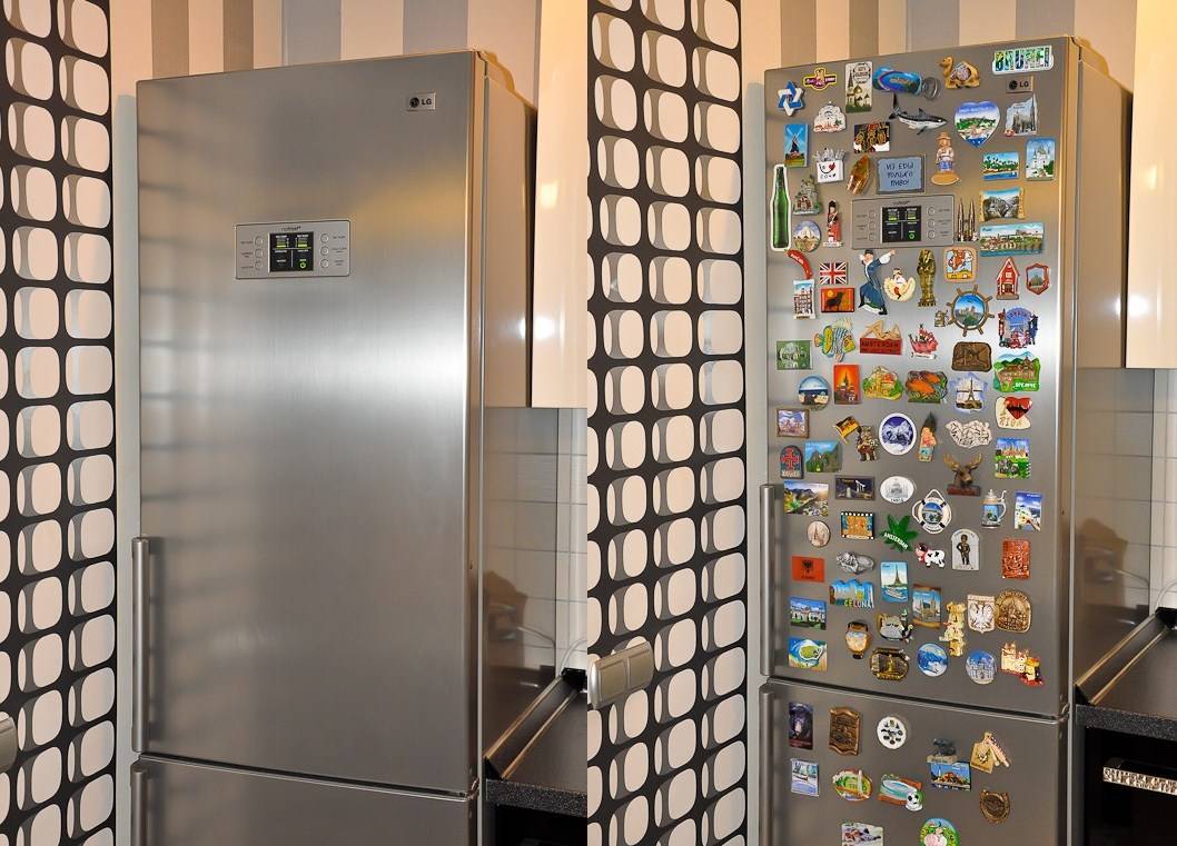 Нет ничего проще, чем отреставрировать агрегат с помощью магнитиков. Их можно приобрести в любых сувенирных магазинах, у многих есть фото на такой основе. Любители экспериментов найдут в интернете инструкции, как своими руками сделать магниты: