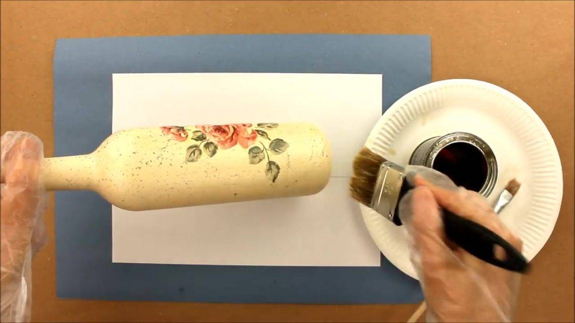 Покрытие коричневым лаком для декупажа поверхности бутылки