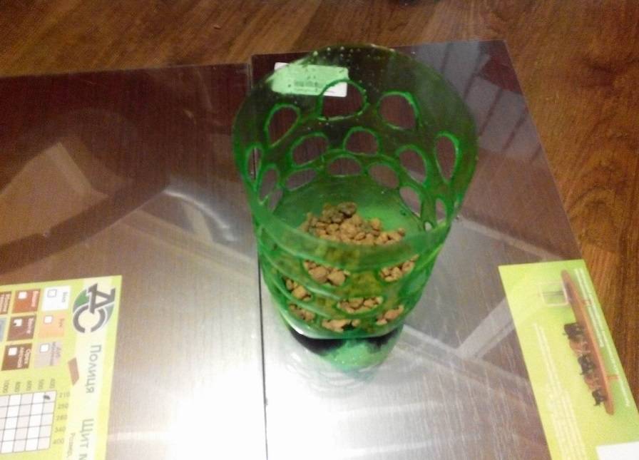 Затем необходимо сделать отверстие в верхней корзине для того, чтобы засыпать внутрь керамзит. Чтобы он не просыпался в отверстие в корзине, керамзит должен быть среднего или большого размера. Полученное устройство помещают в ведро, куда ставят аквариумную помпу, трубы которой следует провести до самого верха.