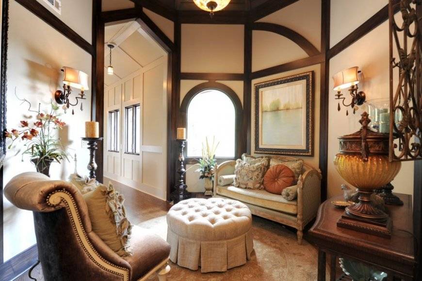 Массивная и основательная деревянная мебель (столы, шкафы, стулья) и мягкие диваны с нежной светлой обивкой, бежевые стены и потолки, все это относится к оформлению в английском кантри.