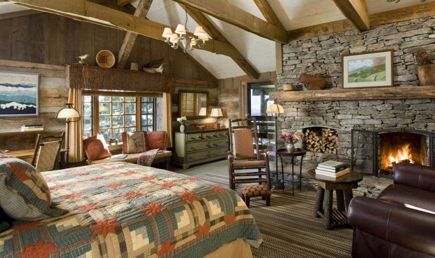 Камин из натурального камня — незаменимый атрибут в интерьере в деревенском стиле.