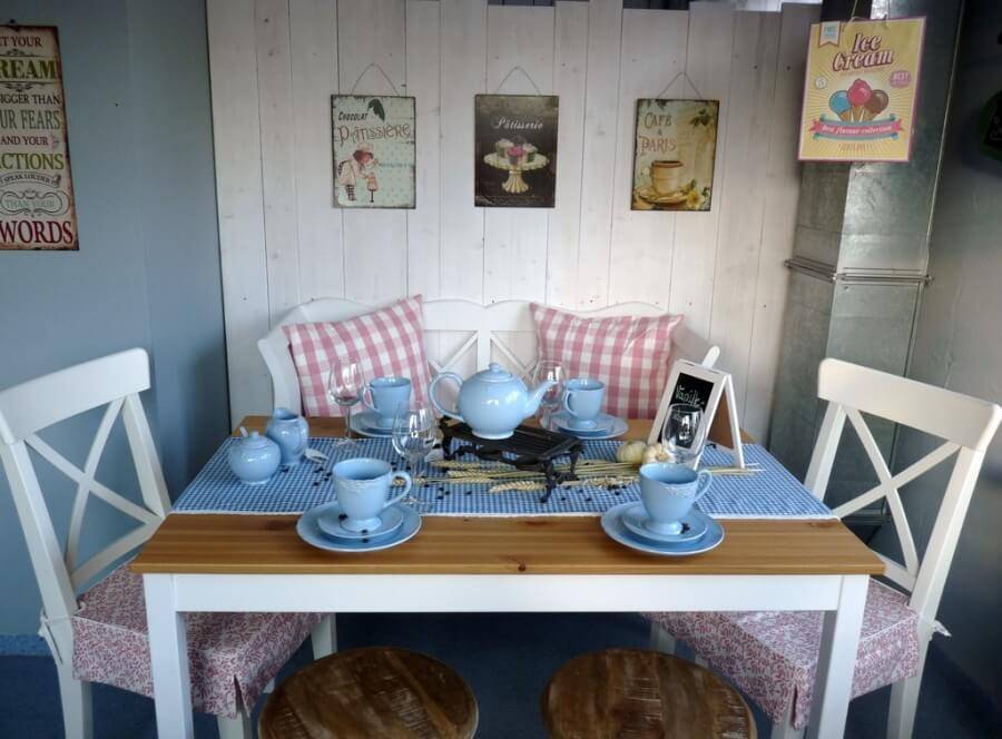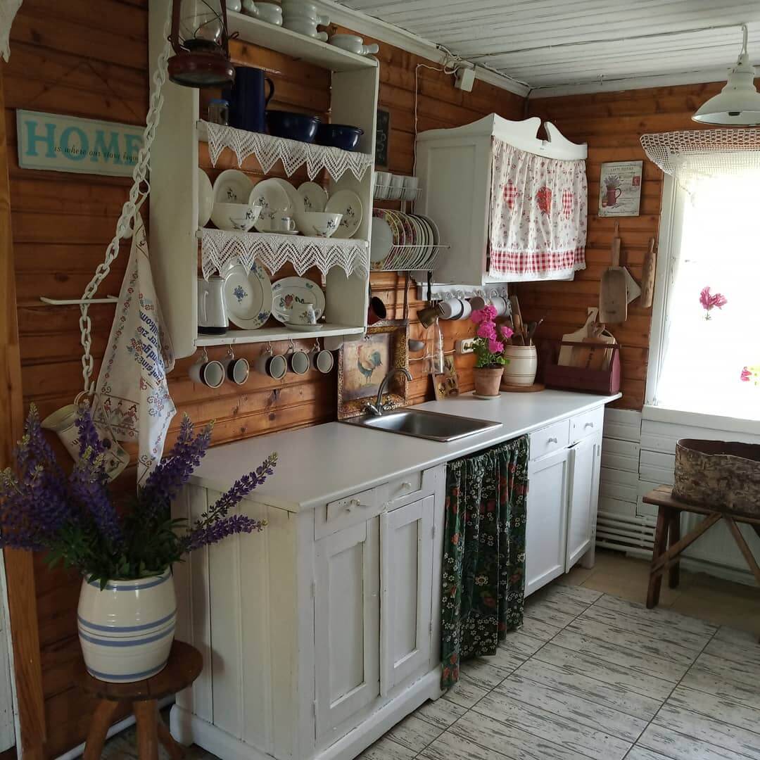 Обилие текстиля. Гардины, коврики, покрывала, подушечки, полотенца и прочие мелочи несут с собой атмосферу очарования, особенно ими пестрит деревенская кухня. Этот дизайн предполагает исключительно натуральные материалы. Часто здесь используется техника пэчворк, или лоскутное шитье, а также кружевные элементы;