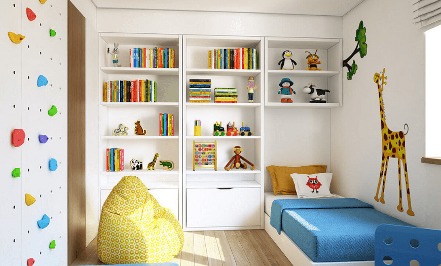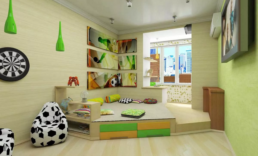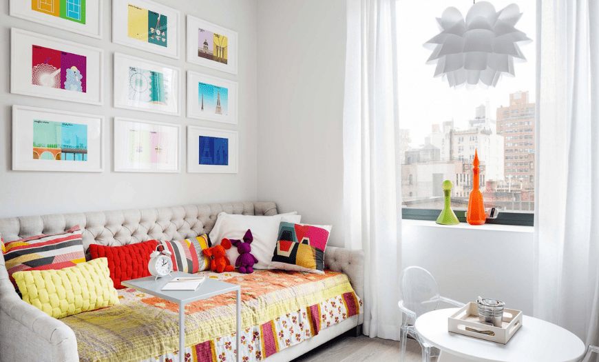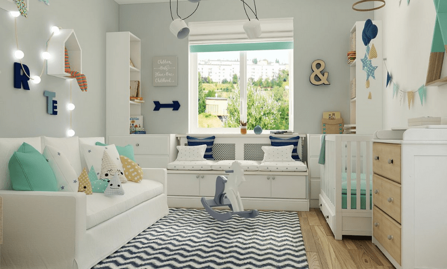 - Не забывайте про яркие акценты в виде настенного декора, постельного белья, штор, подушек и игрушек.