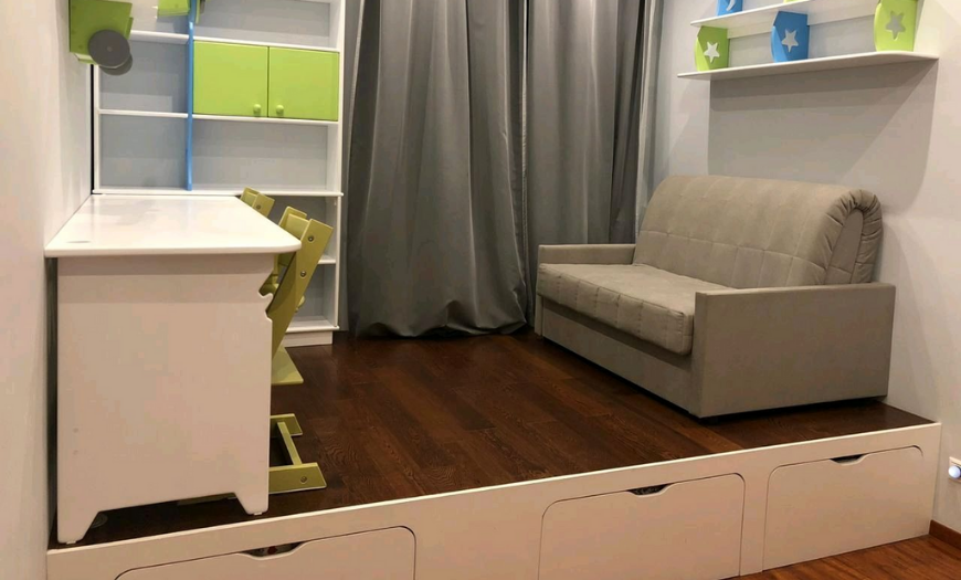 Подиум — одно из средств зонирования помещения. Чем выше платформа, тем прочнее она должен быть. Небольшую строят из деревянного бруса, а высокую – с применением металлического каркаса. В изготовлении используют дерево, брус, ДСП.