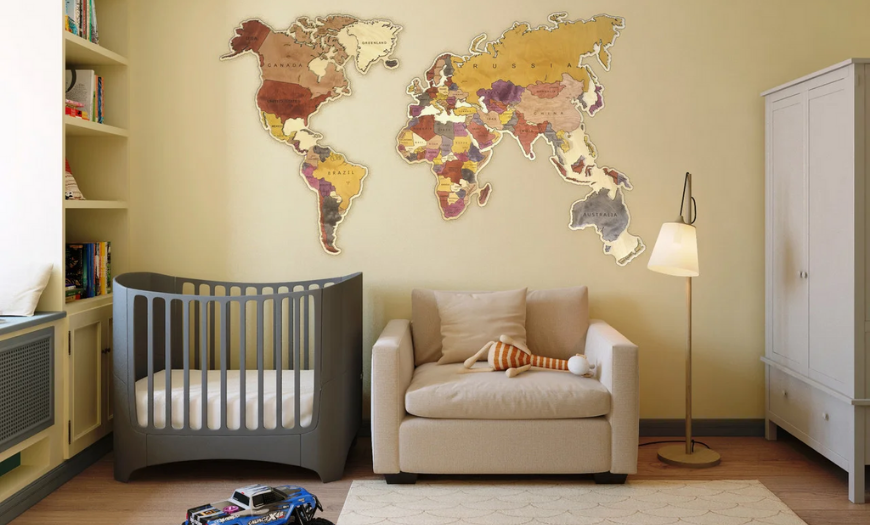 Одну из стен можно отделать кирпичом, пробковым покрытием, повесить большую карту мира, поклеить меловые обои или нарисовать граффити. Так дизайн комнаты станет интереснее, но при этом не «перегрузится» деталями.