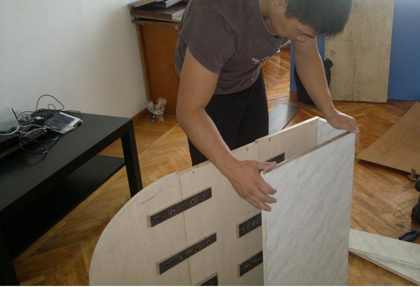 Первым делом надо подготовить древесину для деревянного каркаса книжки (сиденья, спинки, подлокотников, ящиков для белья). Скручиваем бруски, усиливаем поперечными рейками, прибиваем ко дну лист фанеры. Образовавшиеся ячейки будут ящиками в диване.