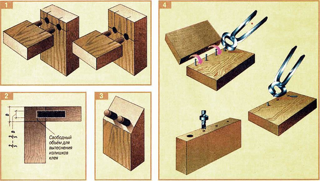 Традиционно деревянная мебель собирается на шкантах. Шкантовое соединение невидимо и дешево; на всякий случай напомним, что это такое и как делается, см. рис. Для соединения деревянных деталей используются деревянные же шканты, усыхающие вместе с соединенными деталями; практически не усыхающая ЛДСП соединяется пластиковыми шкантами. Угловые пластиковые шканты мало употребительны, т.к. часто ломаются. Соединения деревянными шкантами, как правило, проклеиваются.