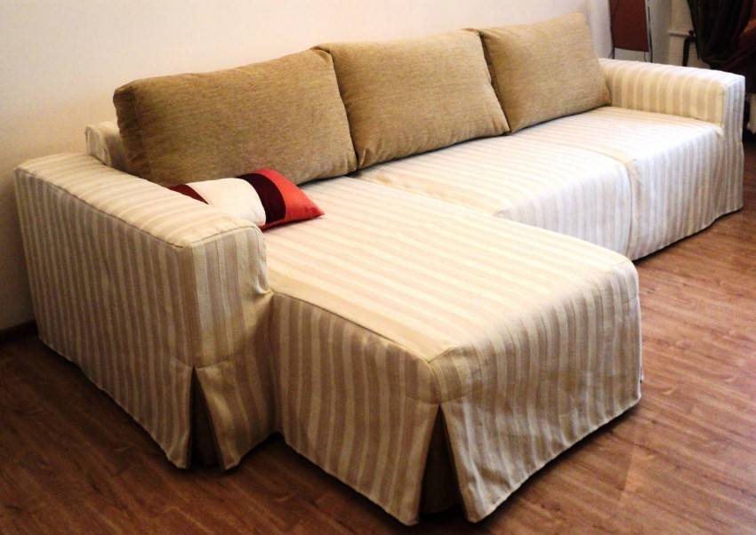 Наметав швы, наденьте чехол на диван – он должен без особых усилий надеваться, облегая обшиваемое изделие. Если он получился слишком тугим или слишком свободным, то это нужно исправить, сняв его.
