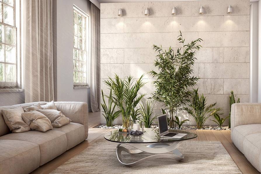 - Растения — еще одна особенность стиля. Достаточно расставить растения с сочными зелеными листьями в обычных глиняных горшках и помещение обретет свежесть и натуральность. Создавайте целые цветочные композиции из горшков разного размера и цвета, используйте кашпо, создавайте целый зимний сад.