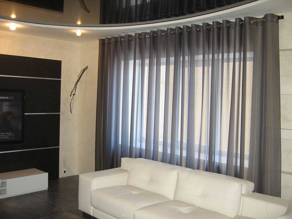 Материалы штор также не должны быть перегружены рисунком и различными элементами. Лучше остановиться на тканях с матовой или же глянцевой поверхностью, например — дамаске, определившись с общей цветовой гаммой комнаты. Если акцент делают на предметах мебели, то следует выбрать переходные холодные оттенки, сочетающиеся с цветом стен или же меблировки.