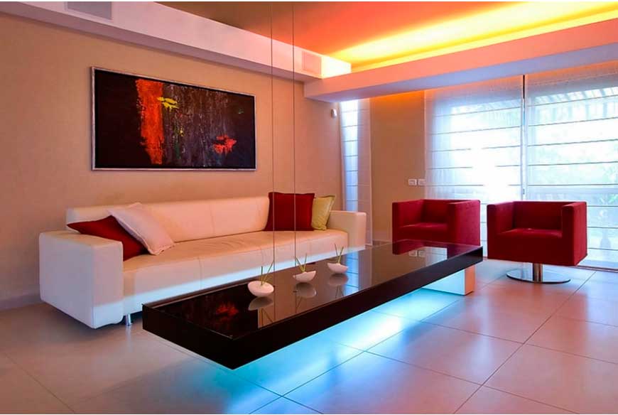 - Приветствуется наличие многоуровневого освещения и ультрасовременной техники, которая не скрывается, а наоборот выставляется на всеобщее обозрение.