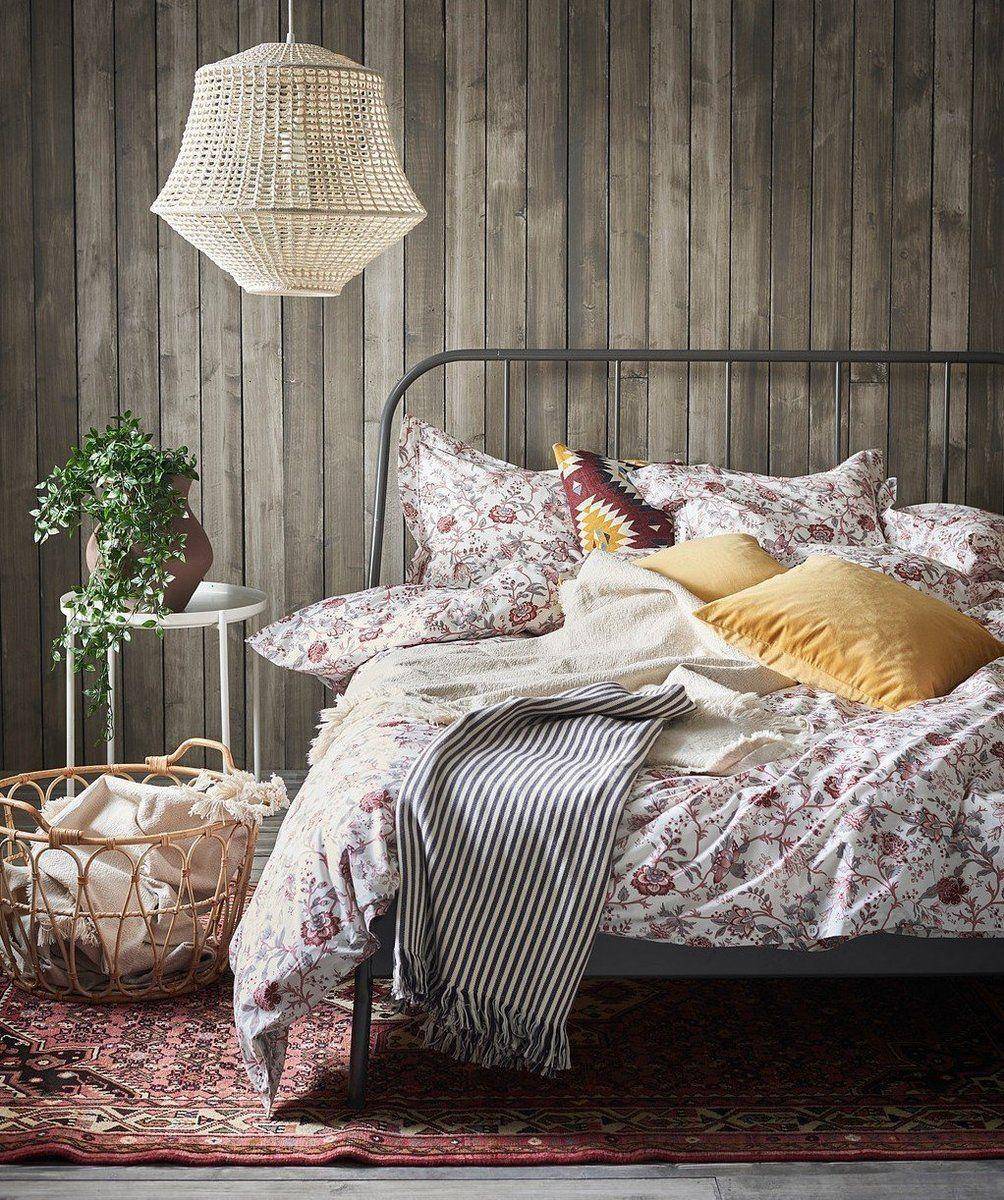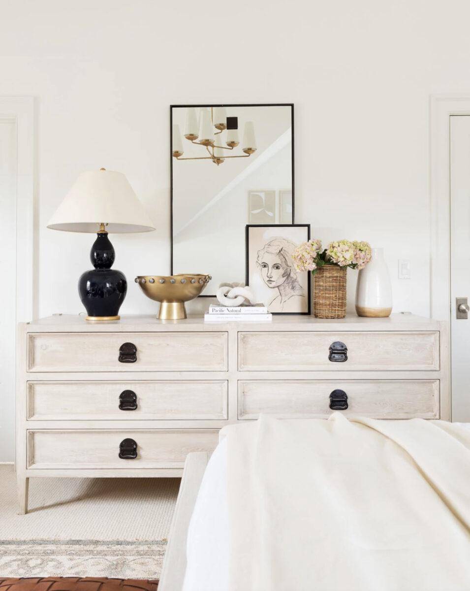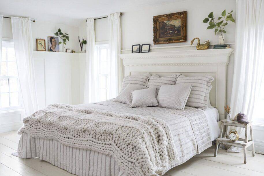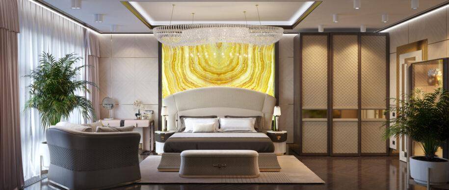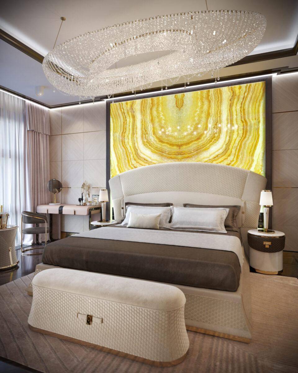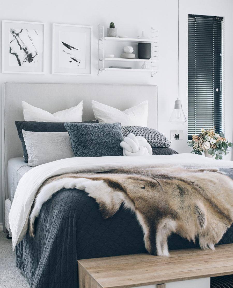 Яркий пример правильного подбора аксессуаров. Спальня выглядит полностью гармоничной